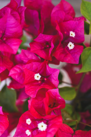 Bougainvillea is a genus of flowering plants in the Nyctaginaceae family, comprising about 18 species. These plants are native to South America, including countries like Brazil, Peru, and Argentina. The name "Bougainvillea" honors the French explorer Louis Antoine de Bougainville, who first documented the plant in the 18th century. Bougainvillea plants are characterized by their woody, thorny vines and clusters of brightly colored bracts, which are often mistaken for flowers. The true flowers are small and typically white or yellow, nestled within the vibrant bracts that come in shades of magenta, purple, red, orange, pink, and white. The foliage is lush and green, with some varieties exhibiting variegated leaves. Bougainvillea plants are evergreen in warm climates but can behave as deciduous plants in cooler regions.