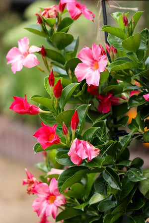 Hanging Baskets: Smaller varieties of Mandevilla can be grown in hanging baskets, adding a touch of elegance and color to porches and patios. The trailing vines and flowers create a cascading effect that is both beautiful and functional.