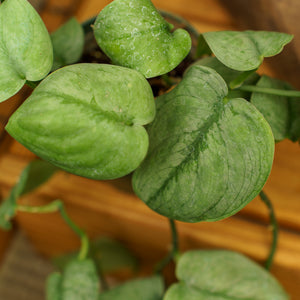 Pothos plants are characterized by their glossy, heart-shaped leaves, which can range in color from deep green to variegated patterns of green, yellow, and white. The leaves can grow quite large, especially in their native tropical habitats, but they typically remain smaller when grown indoors. Pothos plants have a trailing or climbing habit, making them ideal for hanging baskets, shelves, and trellises.