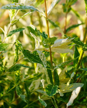 Few plants put on a foliage show like Dappled Willow. In early spring, new leaves emerge a soft pink that gradually fades into a marbled combination of white, light green, and cream. This variegation continues through summer, offering brightness in both sun and part shade. The stems provide year-round interest too—particularly in winter, when their reddish tones stand out against dormant landscapes.