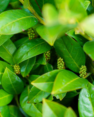 The shrub’s leathery, deep green leaves retain their luster through winter, offering dependable evergreen color in shaded areas. In spring, it produces short spikes of white flowers (modest but attractive), which offer soft seasonal contrast against the dark foliage. Though the blooms are brief, they add important spring interest, while the tidy foliage provides summer presence well into the warmer months.