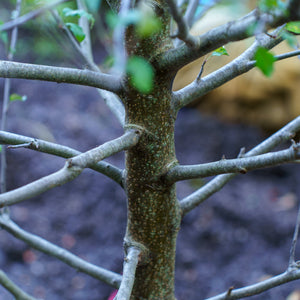 Dig a hole twice as wide as the root ball but no deeper. Place the tree so the graft union (if visible) sits a few inches above soil level. Backfill with native soil, water deeply, and apply mulch around the base, keeping it away from the trunk.
