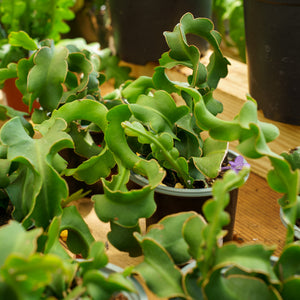 - Epiphyllum 'Shark Tooth' – with jagged, zig-zag stems and occasional blooms.