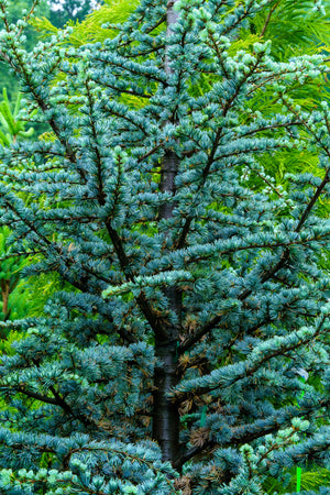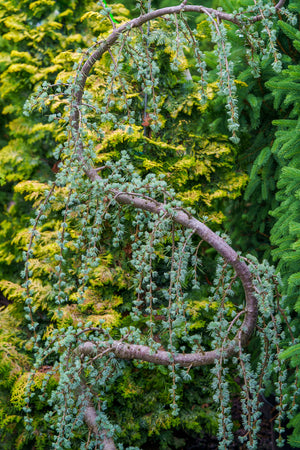 Atlas Cedars, like Cedrus atlantica 'Glauca' and Cedrus atlantica 'Glauca Fastigiata', are prized for their shimmering blue-green foliage and strong pyramidal structure. Weeping forms like Cedrus atlantica 'Glauca Pendula' and Cedrus atlantica 'Blue Cascade' offer dramatic cascading silhouettes that command attention in garden settings. Cedrus deodara 'Feelin' Blue' and Cedrus deodara 'Prostrate Beauty' serve as ground-hugging alternatives for slopes and retaining walls.