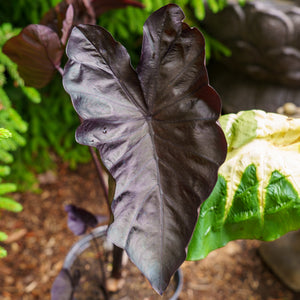 Colocasia pairs beautifully with other moisture-loving plants such as ferns, impatiens, coleus, and grasses for a layered, textural display.