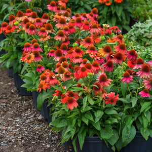 Modern cultivars expand far beyond the traditional purple form, offering rich oranges, vibrant reds, sunny yellows, and even green or multicolor blooms. Highlights include Echinacea 'Cheyenne Spirit', a seed-grown mix with a dazzling spectrum of color; the compact and robust 'PowWow Wild Berry' and 'PowWow White'; and the long-blooming 'Sombrero Hot Coral' and 'Sombrero Granada Gold'. The Kismet and SunSeekers series ('Kismet Yellow', 'SunSeekers Rainbow') provide exceptional flower power, while 'Hot Papaya' adds a bold double bloom to the garden. Other standout selections include 'Artisan Red Ombre', 'Artisan Soft Orange', and 'Sweet Fuchsia', each adding new flair to the echinacea palette.