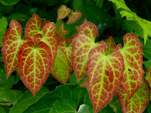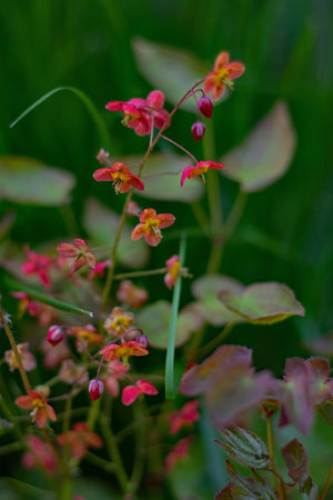 Epimedium is a genus of around 60 species in the barberry family (Berberidaceae), with most varieties originating from China. These low-growing perennials form mounds of heart-shaped or arrow-shaped leaves, often flushed with bronze or red in spring and fall. In early to mid-spring, they send up wiry stems bearing delicate, spurred flowers in shades of yellow, white, pink, red, or lavender.