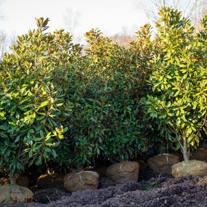 Magnolia grandiflora, native to the southeastern United States, is an iconic evergreen tree with glossy green leaves and large, creamy white, lemon-scented flowers. Cultivars like 'Bracken’s Brown Beauty', 'Little Gem', and 'Edith Bogue' offer improved cold hardiness and more compact habits, making them adaptable beyond their native range.