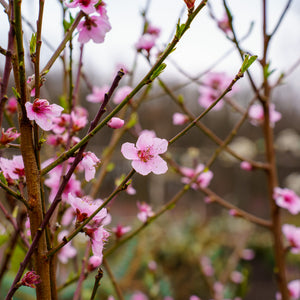 Prunus persica includes a wide variety of cultivars that produce yellow or white-fleshed fruit, either clingstone (where the flesh clings to the pit) or freestone (where the pit separates easily). Peaches are prized for their fuzzy skin, fragrant aroma, and sweet-tart flavor profile. The trees themselves are deciduous, with lance-shaped leaves and stunning pink to light rose-colored blossoms that appear in early spring before the foliage emerges.