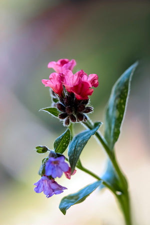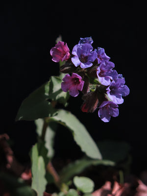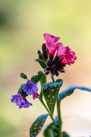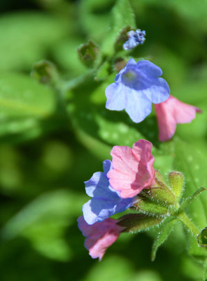 Pulmonaria belongs to the borage family (Boraginaceae) and is native to Europe and western Asia. It’s among the first perennials to bloom in spring, often producing clusters of tubular flowers in pink, blue, purple, or white. Interestingly, flowers can change color as they age, giving the plant a two-toned appearance.