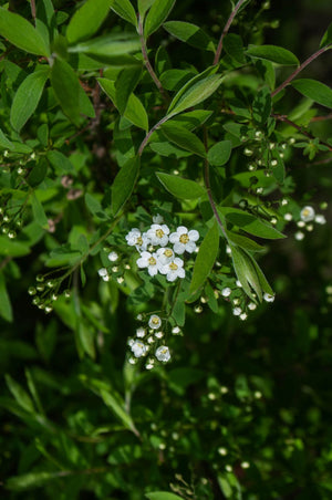 - Spiraea thunbergii 'Ogon', valued for its fine texture and golden spring foliage.
