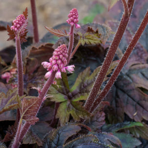 Foliage can be deeply cut or rounded and frequently features striking veins or marbling, as seen in 'Fingerpaint', 'Angel Wings', and 'Timbuktu'. Many varieties provide multi-season interest, with foliage taking on bronze, burgundy, or maroon tones in cooler months. Foamflowers are also valued for their pollinator-friendly blooms, which attract native bees and hoverflies.