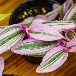 - Tradescantia albiflora 'Nanouk', with thick stems and pastel pink-striped leaves.